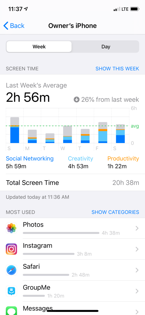 Note how my social networking usage reduced by about a third of the week before the detox. I’m not sure why we still see dark blue during the weekdays, but I can assure you that I didn’t go into Instagram/Snapchat/Facebook.