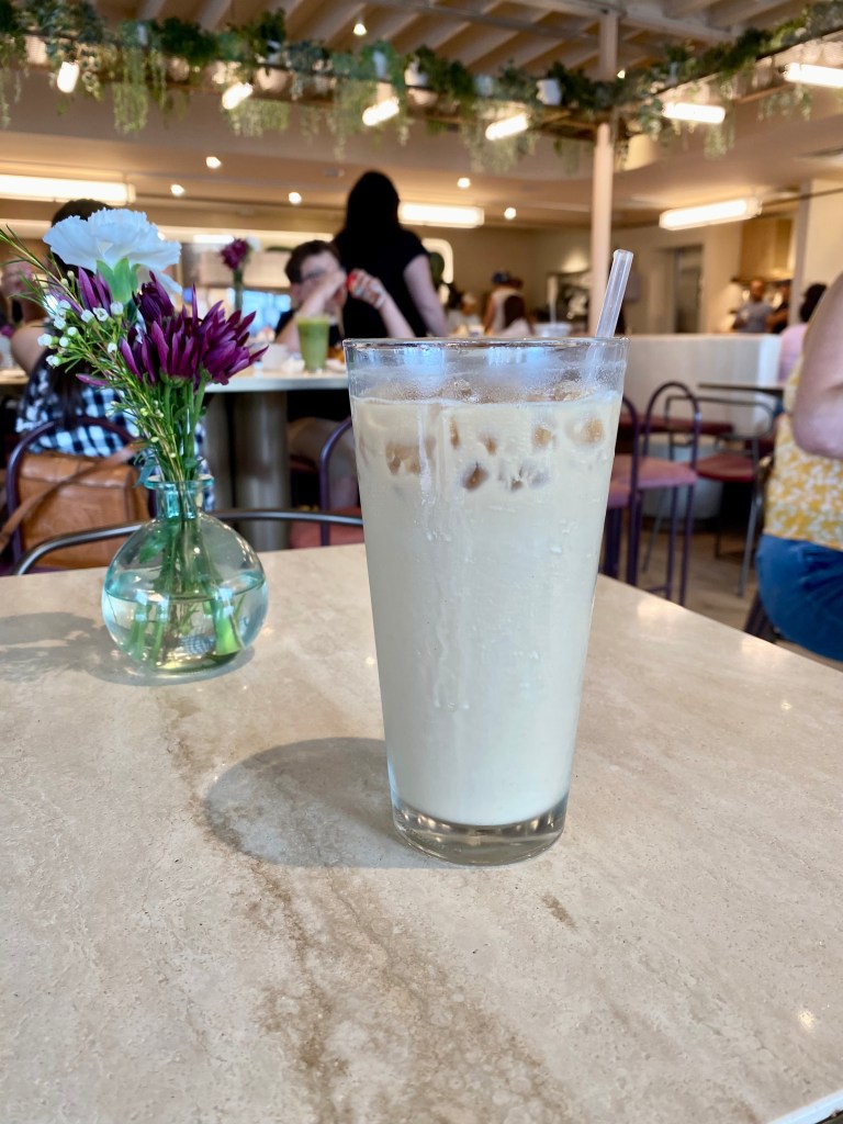 Oh isn’t it such a lovely place? I just love the ambiance here. The name tags and pronouns for the baristas are a nice touch. The greenery letting their vines down from this brasserie hanging in mid-air. The lighting bouncing off the bronze of the said brasserie. That one guy over there reading Hemingway. Another one grading papers with a red Sharpie. And of course, you have Laufey playing in the background.